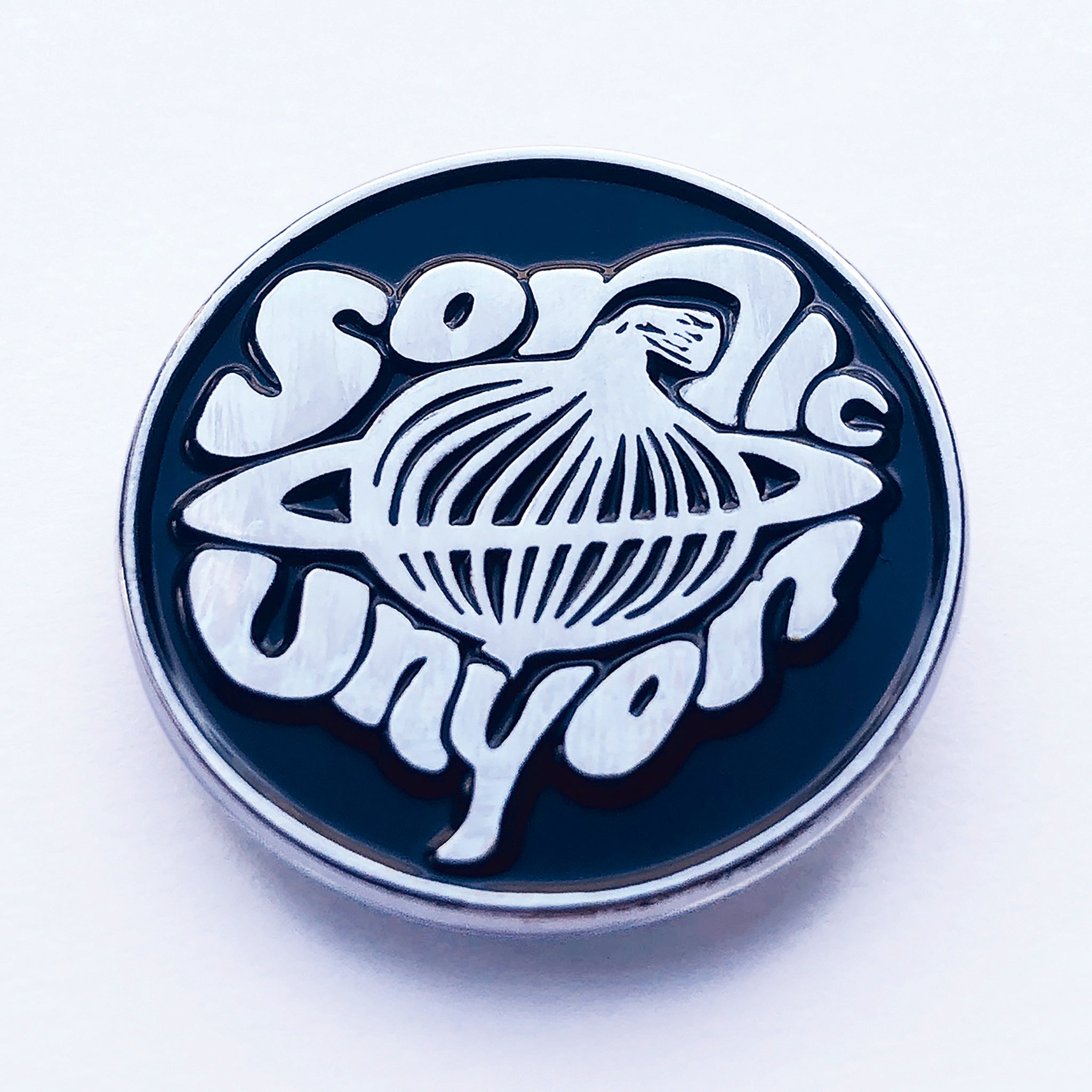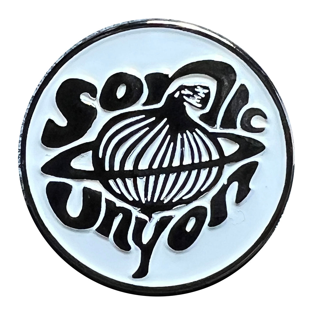 Show your support for independent music and the lifers at Sonic Unyon with this handsome 1993-era logo pin (1.25", backed with a stick pin and butterfly clutch) minted in honour of the label's silver anniversary. Available in black or white enamel on silver metal.